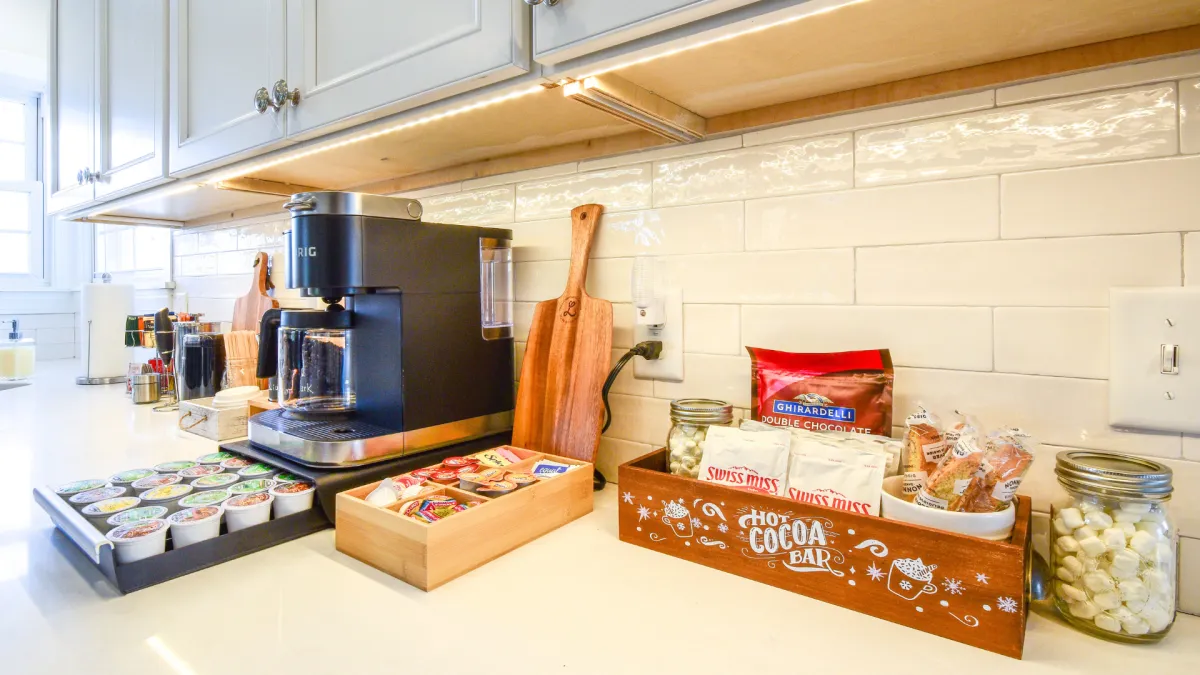 Kitchen was STOCKED. Everything from coffee to a hot chocolate bar. The host even left some snacks (we used some of the milk, Melissa!). There was no wine opener, but that didn’t stop us! Plenty of plates and utensils and cookware.